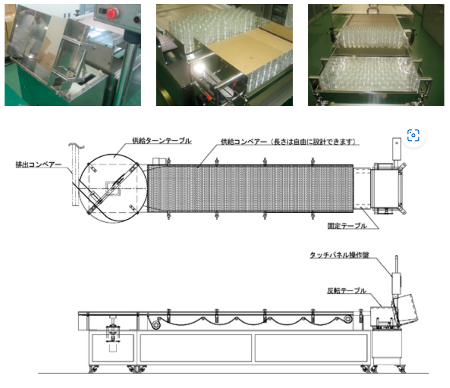 - ダンボール箱を反転テーブルに載せるだけ。あとは自動反転・自動昇降。煩わしいガラス容器整列作業から解放されます。
