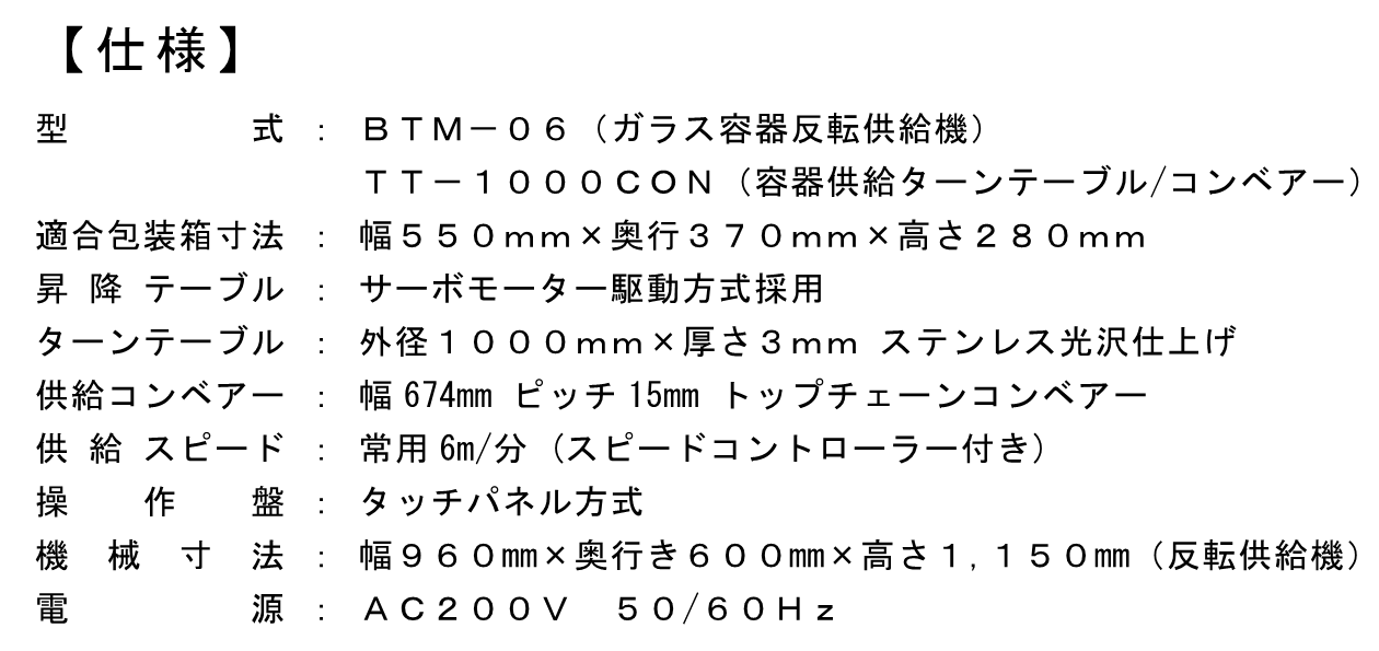 BTM-06『BTM-06』は、底部を開封されたガラス容器入段ボール箱を、開封面が奥になるよう人手にて
