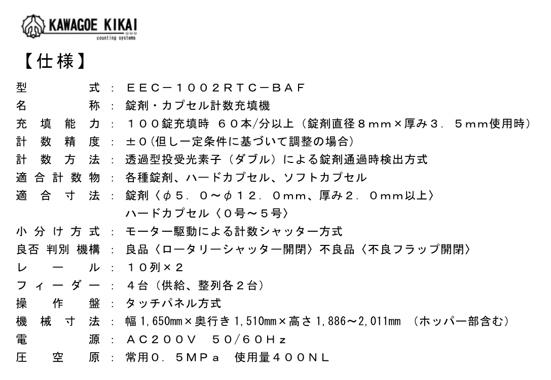 EEC-1002RTC-BAF『EEC-1002RTC-BAF』は、充填数が100錠以下の製品で分間60本以上の