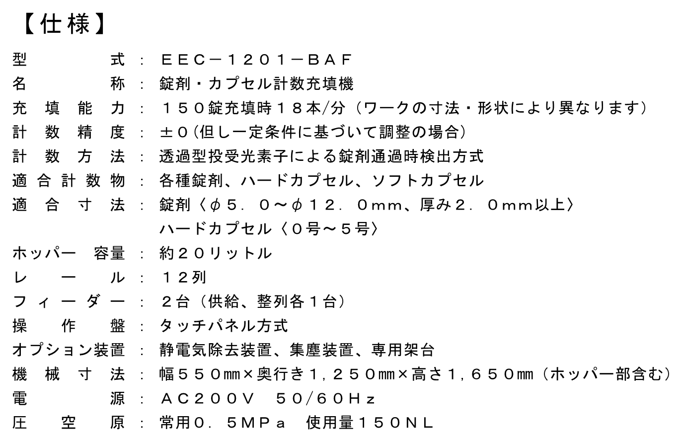 EEC-1201-BAF『EEC-1201-BAF』は、錠剤・カプセル等を小分け計数充填するためのもので、