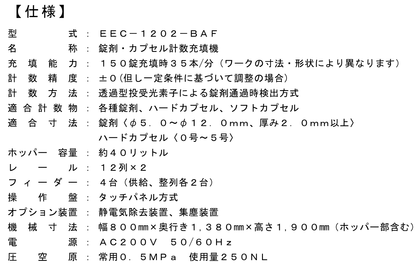 EEC-1202-BAF『EEC-1202-BAF』は、錠剤・カプセル等を小分け計数充填するためのもので、