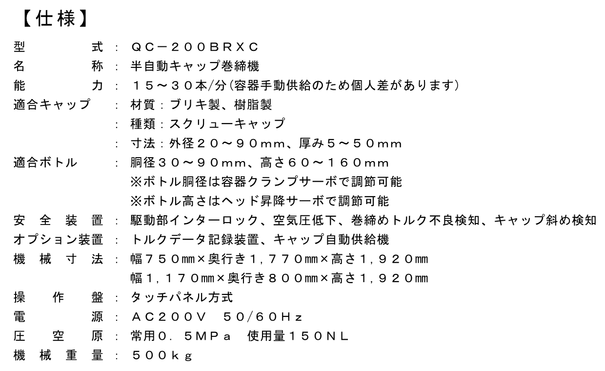 QC-200BRXC本機は、簡易式ボトル搬送コンベアーと切り出し装置を搭載した半自動キャップ巻締機です。